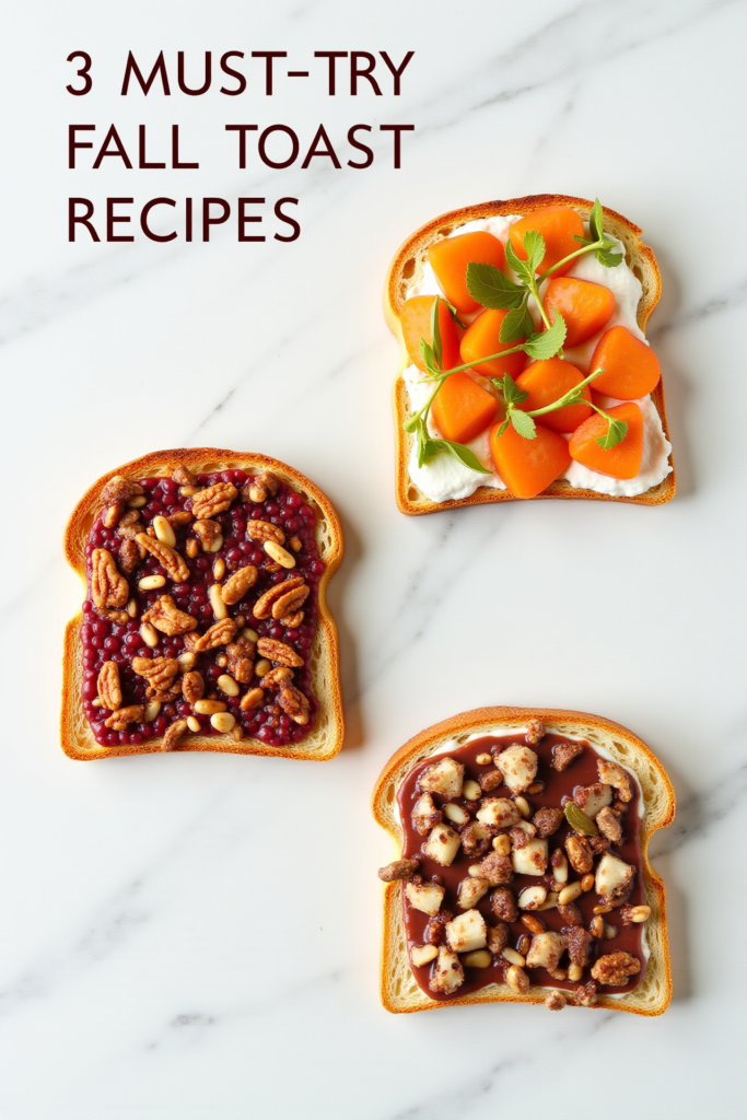 Serve these toasts warm, paired with a hot cup of chai or cider. Layer on extra toppings such as pomegranate seeds for color, pumpkin spice for a classic fall touch, or a sprinkle of microgreens for a fresh finish. Each recipe can be cut into halves or quarters for elegant appetizer platters—ideal for brunches and gatherings.