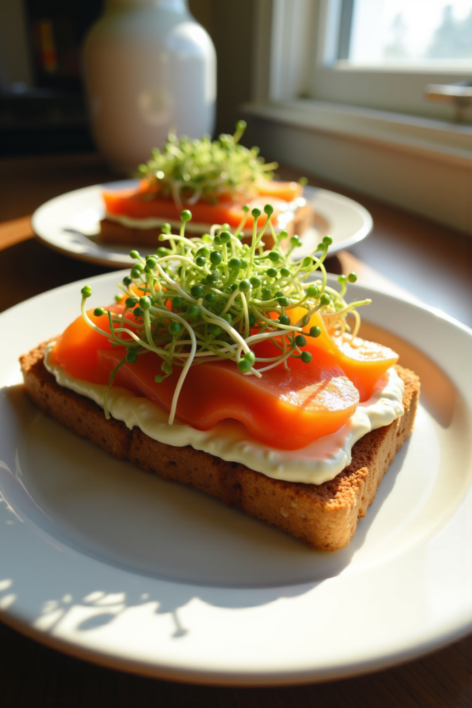 This recipe serves 2. Each toast provides roughly 350–400 calories, with beneficial protein and healthy fats from the salmon and labne. It’s a nourishing way to start your day—and with whole grain bread, you’ll stay satisfied even longer.