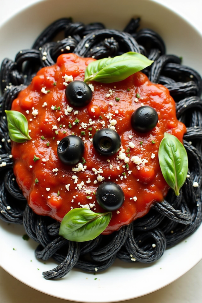Serve this eerie pasta alongside garlic bread “bones” or a vibrant green salad for a complete Halloween feast. For an extra theatrical touch, scatter a few edible fake spiders (made from black olives) on top of the pasta. Pair with blood orange soda or a bold red wine for an adult dinner party.