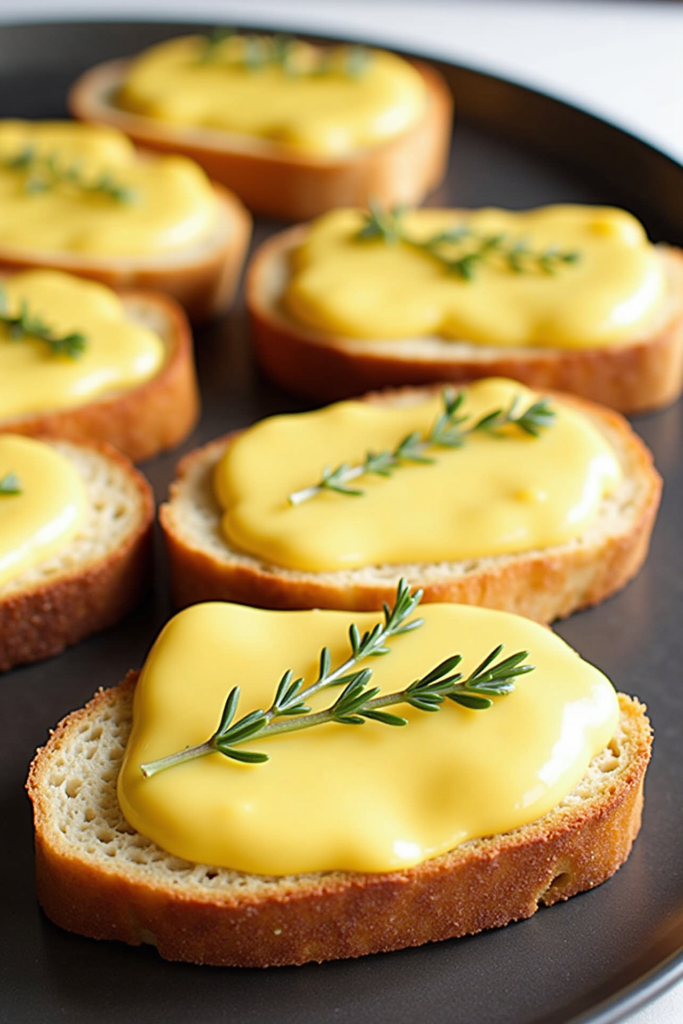 - Spoon the hot cheese mixture over each bread slice, spreading evenly. Return to the broiler and cook for 2–3 minutes, until the top is bubbling and golden brown.